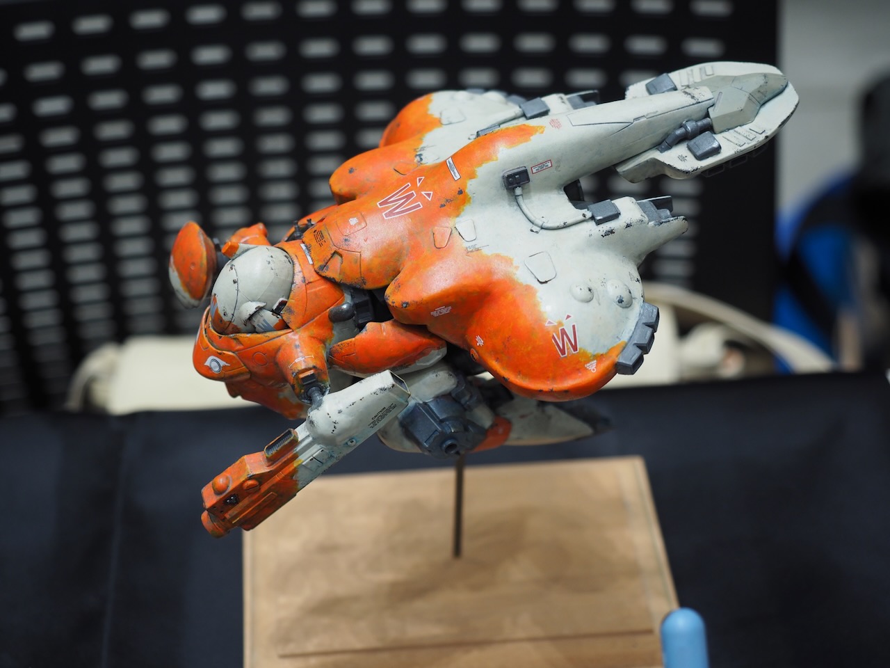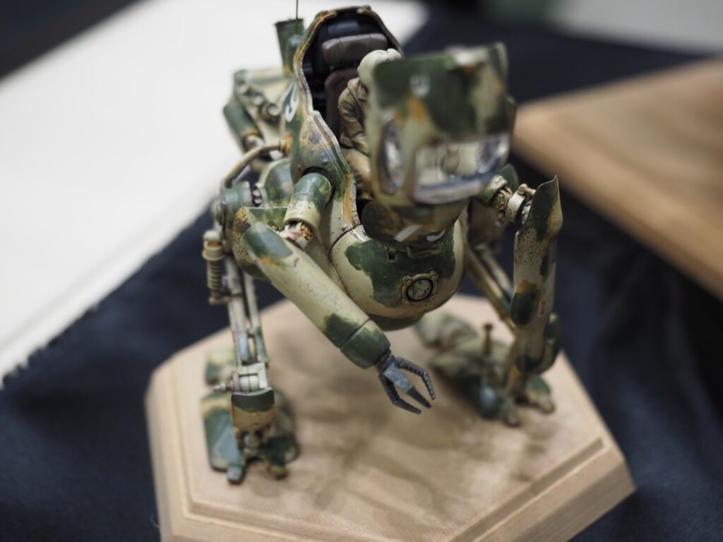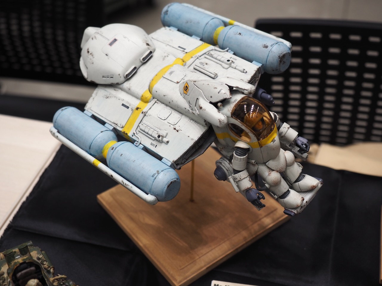 今回、私の持ち込みは写真の4作品。 プラモデルキット、ガレージキット、自作スクラッチ品x2の合計4種の持ち込みです。 近々に組んでいたのは月面ホルニッセ(仮)、横山先生のバンドデシネからのインスパイアですが、出典ご存知のかたも多く、「あの絵一枚からは立体起こすの大変ですよね」とのお言葉結構いただきました。 「そですよね、なんで最終的にはインスパイアされたオリジナルになりました」と言う感じに応えてました。 スクラッチににに使ったガンプラの元ネタも見抜く方も多く、さすがマシーネン好きが集まっていると言う感じでした。 シーサーペントは版元の誠MODELSさんにも声かけしていただいてうれしかったですね。