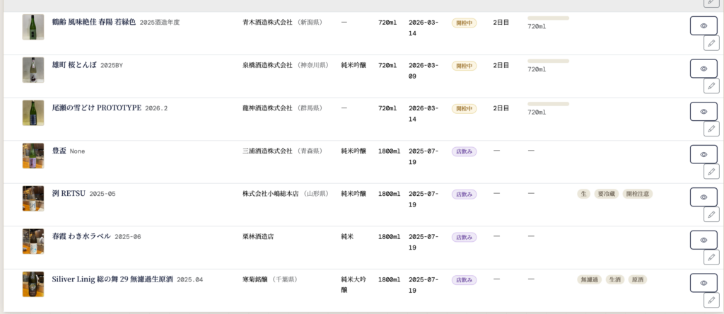 あとは使い勝手の改善です。在庫管理だけでしたが、お店で飲んだ記録も入れられるようDBスキーマとUIを修正。情報更新時の登録漏れを防ぐため、保存前にページ移動できないようにしたり、見た目の色調を見間違えにくく調整したりしました。