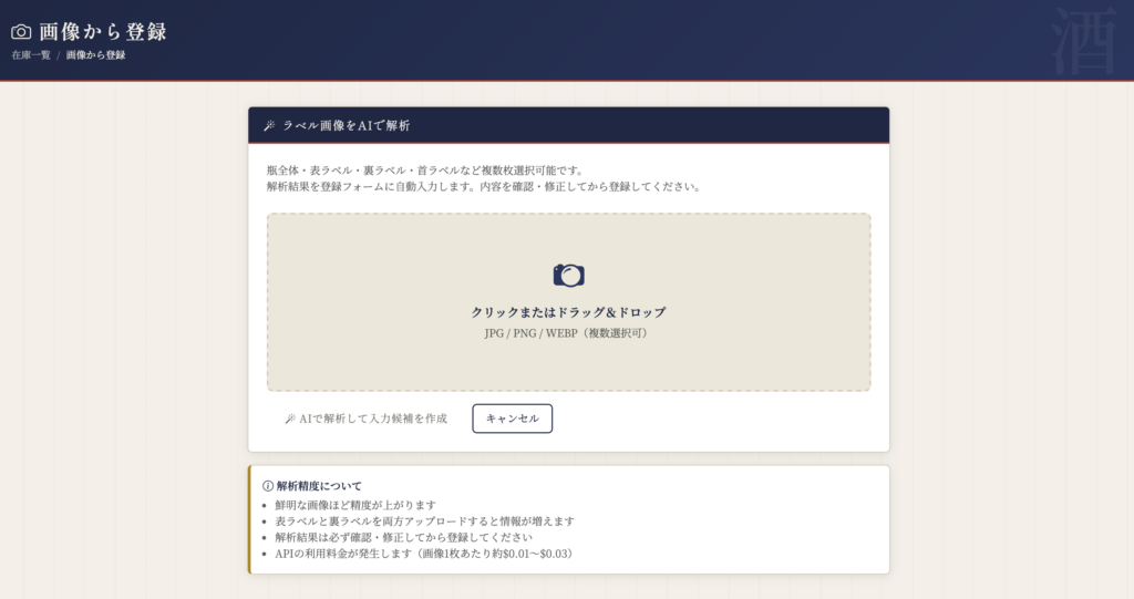 前回、一通りの機能はできたんですが、たまった膨大な日本酒のデータ入力がまだ終わっていません。瓶ラベルをChatGPTがOCR認識してくれるので、ローカルデータからデータを作ろうとワークフローをChatGPTに整理させたところ、データフォルダーをPythonスクリプトで読み込んでChatGPTにAPI経由で送る方法を提案されました。ローカルの処理系を整備するかなと思ったんですが、よくよく考えると、WebアプリにChatGPT APIを組み込んで処理させたほうが、新規登録時の入力項目も作ってくれて楽じゃないかという考えに至りました。この機能、日本酒管理のiOSアプリとかにあるのは見たことがあったんですが、以前使ったものはラベルのマッチングで動いていたようであまりうまく動かなくて、すぐ使わなくなっていたので、すっかり忘れてました。