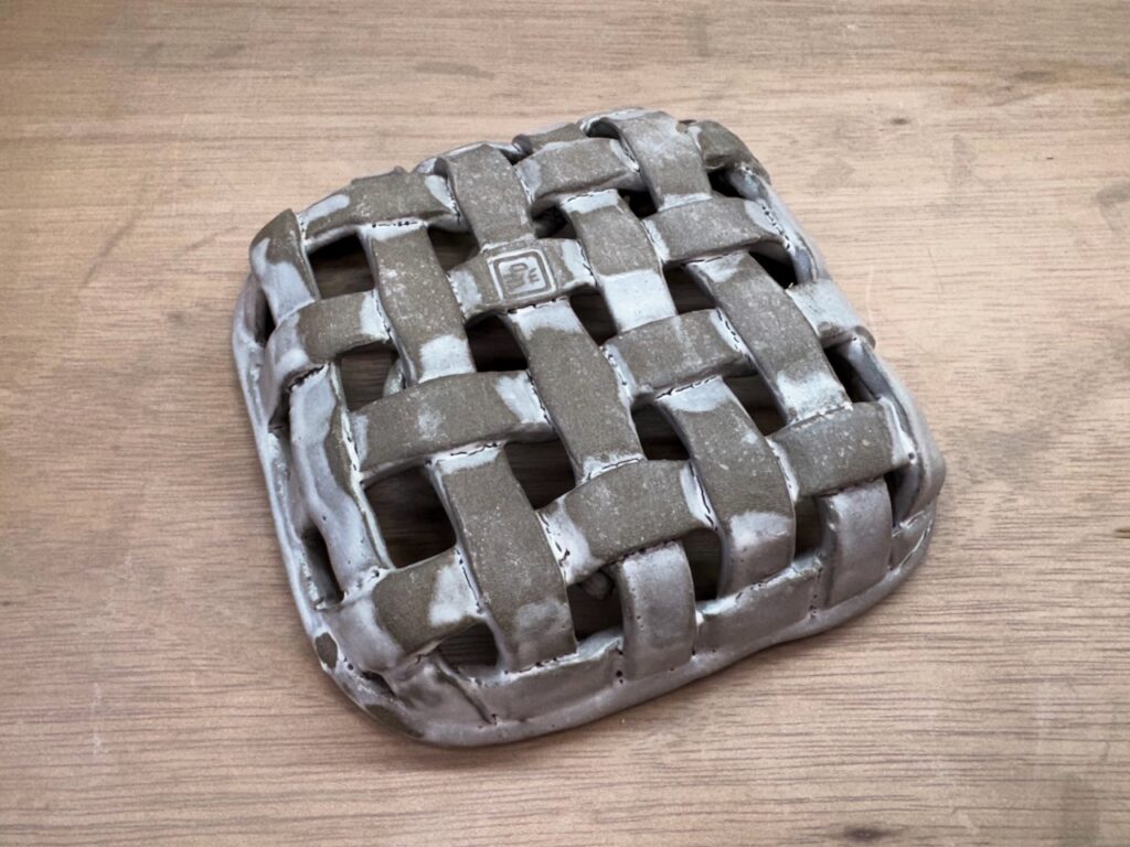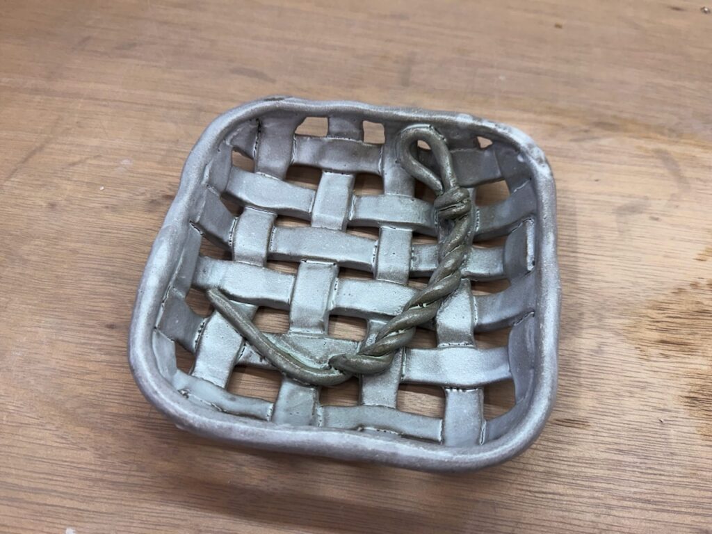 陶器のカゴを作ってみました。 あまり粘土を消費したかったのでいろいろな粘土ミックスで作ってます。この手の造りだと乾燥や素焼きでひびや剥がれがでるかなと心配してましたが、無事に本焼まで乗り越えました。釉薬は乳白掛けたかな? ミックス粘土なんで素地が強くでてしまっていて、かなりグレーな仕上がりでした。 内部の綱のオブジェは一体にしてますが、この部分には酸化銅の下絵具をして乳白釉薬との反応で青っぽくしたかってんですが、これもグレーよりでした。 ミックス粘土だともっと濃い系の釉薬でやったほうが釉薬の発色はいいのかぁ。